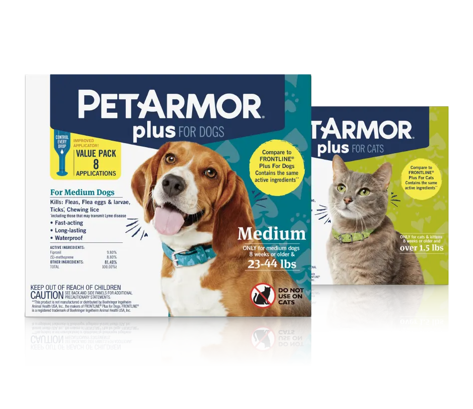 PETARMOR® Plus effectively kills fleas and ticks for less than leading brands.* This easy-to-use, waterproof flea and tick topical kills and prevents fleas, flea eggs, flea larvae, ticks, and chewing lice for up to 30 days. Arm your furry family members with vet-recommended monthly flea & tick preventative from PETARMOR®. Trusted by over 2 million pet parents.**
